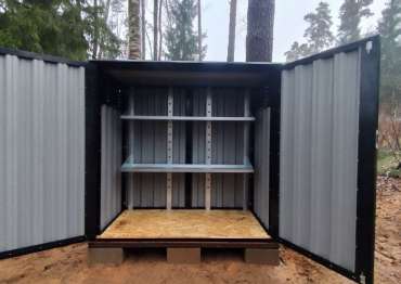 Дополнительно дровницу оборудовали распашными дверями и вентиляционными решетками для дополнительного проветривания по боковым сторонам изделия, а также установили прямой стеллаж с двумя полками.