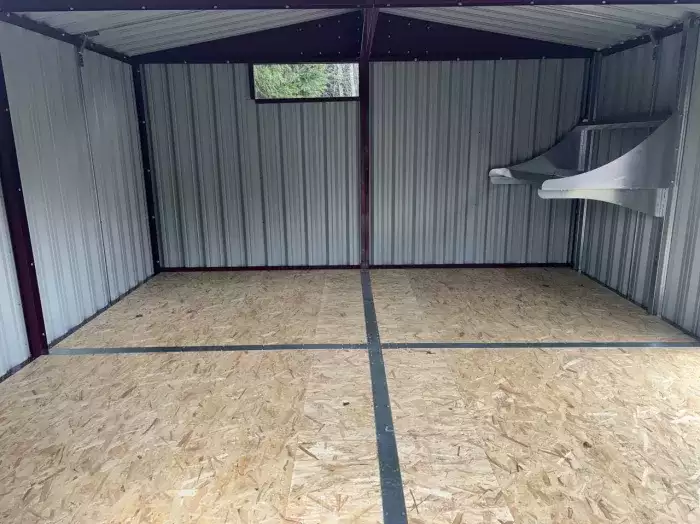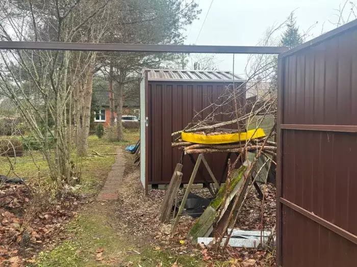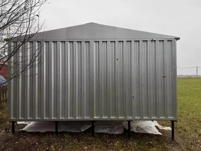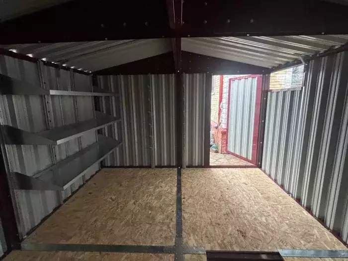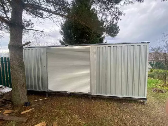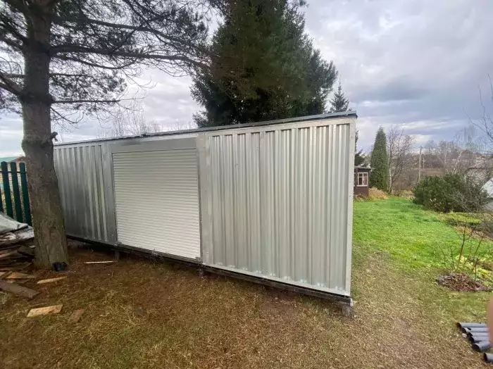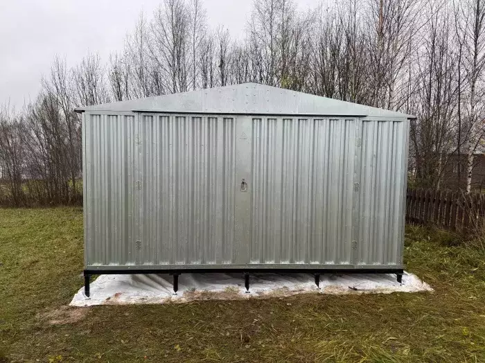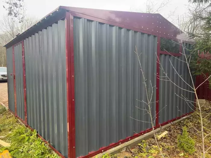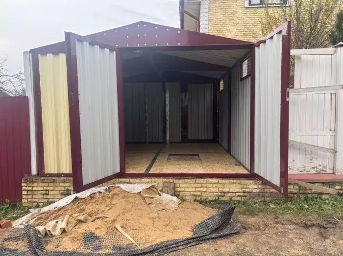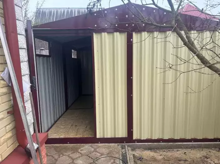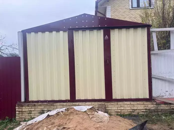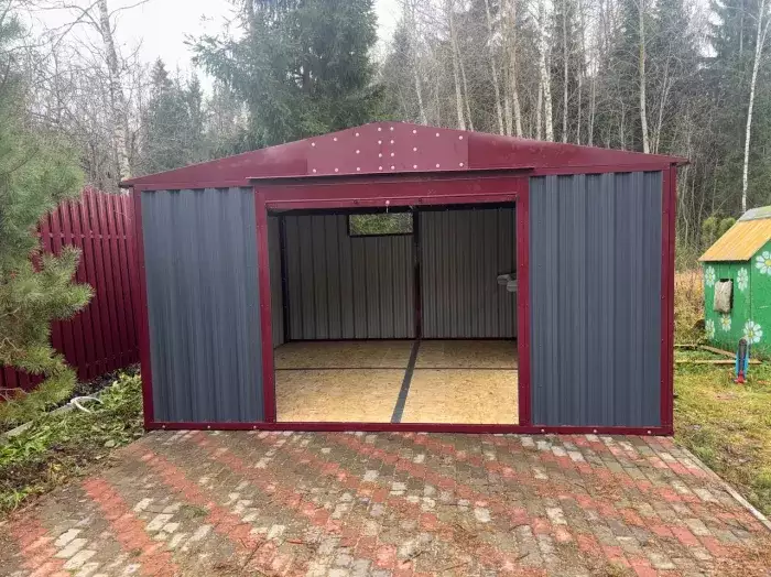 Нами была изготовлена широкая 6-метровая конструкция с двускатной крышей и торцевой воротной группой в популярном шоколадно-коричневом цвете RAL 8017. Дополнительно гараж укомплектовали дверью шириной 1 м по боковой стороне.