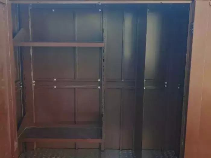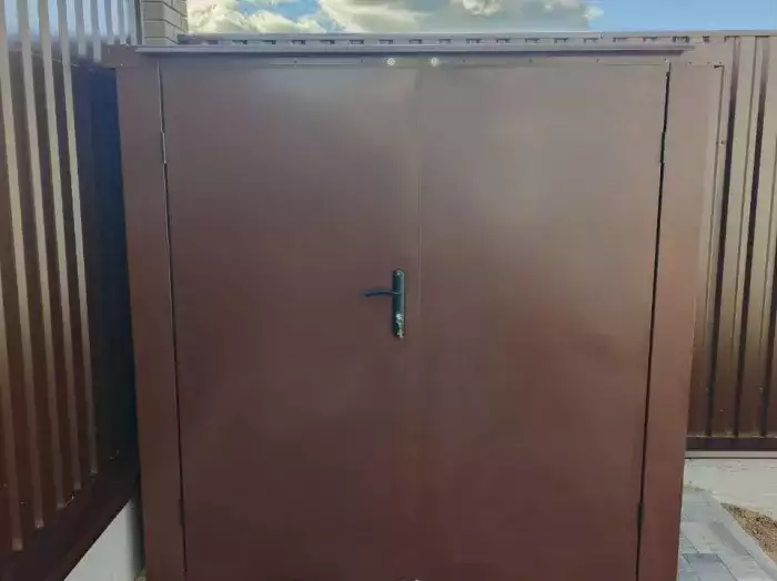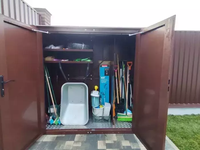 Проект: 3-метровый хозблок для хранения инвентаря в светлом сером цвете.