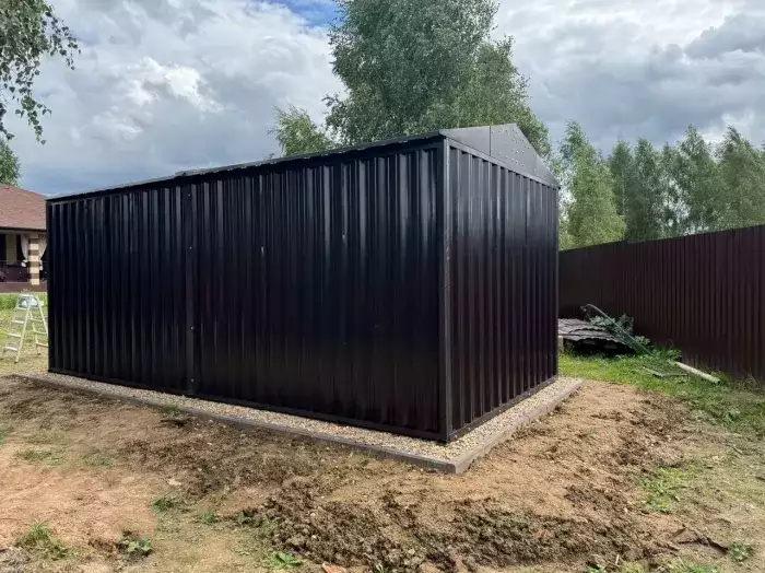 Нами была изготовлена стандартная 5-метровая конструкция с плоской крышей и торцевой воротной группой в блестящем цинковом цвете.