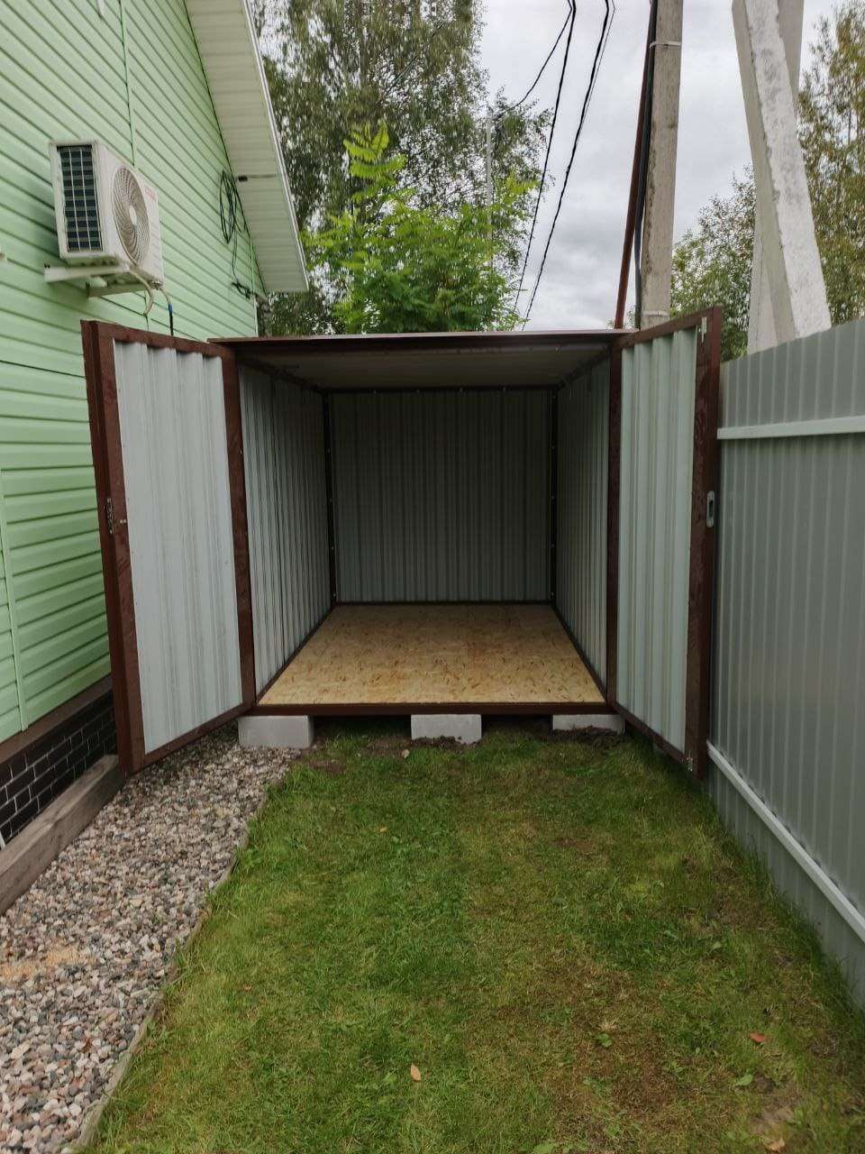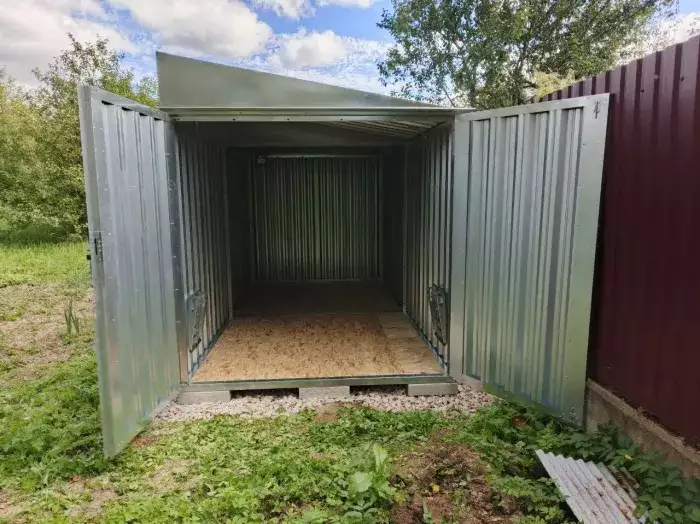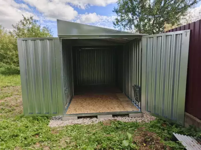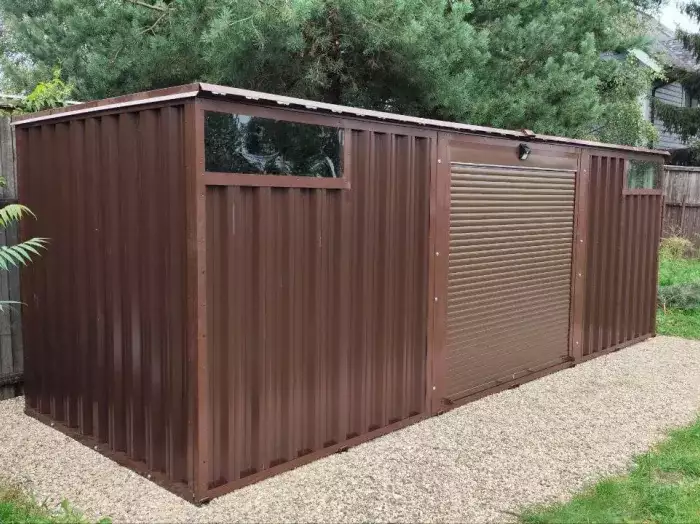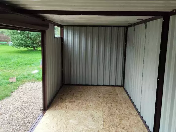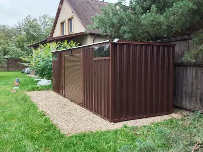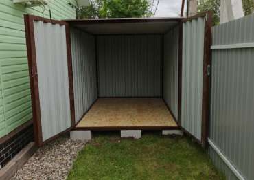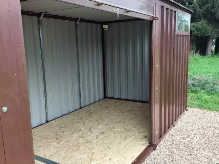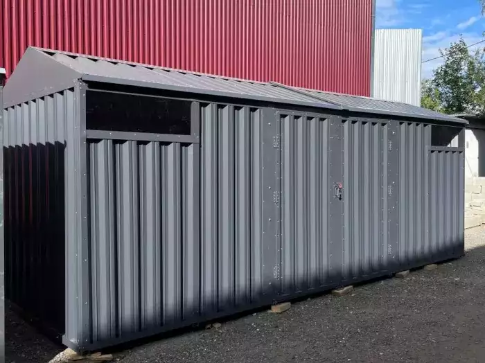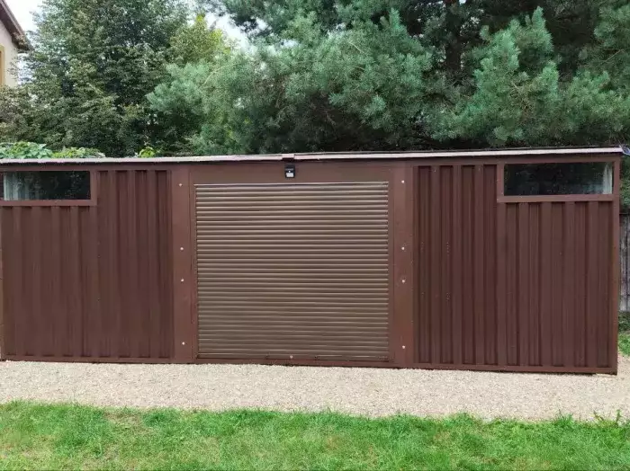 Нами была изготовлена стандартная 3-метровая конструкция с плоской крышей и торцевой воротной группой в красившем сочетании цветов RAL 1014 «слоновая кость» для основных элементов и шоколадно-коричневого RAL 8017 для фасонных элементов и крыши.