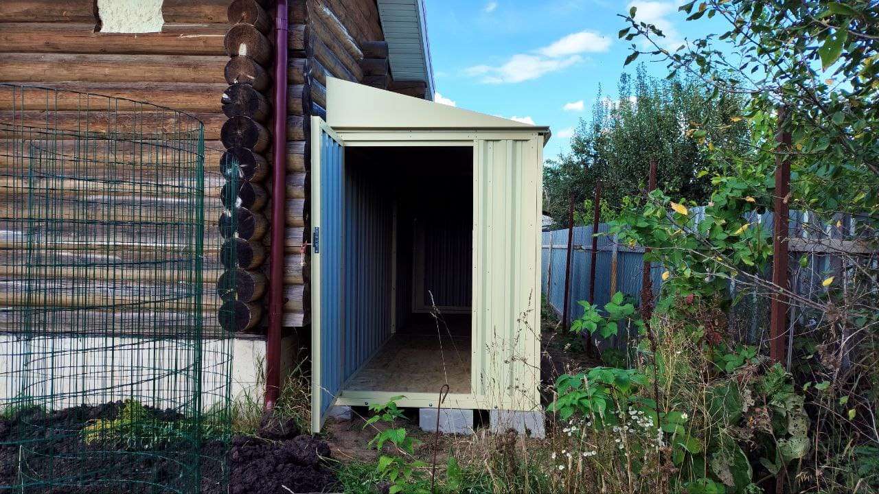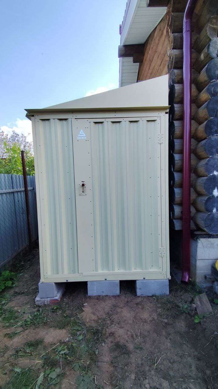 Нами была изготовлена конструкция по индивидуальным параметрам размером 5 х 1,6 х 2,45 м с односкатной крышей и тремя входными группами - с двух торцевых сторон и по боковой стороне в нежном бежевом цвете RAL 1014 «слоновая кость».