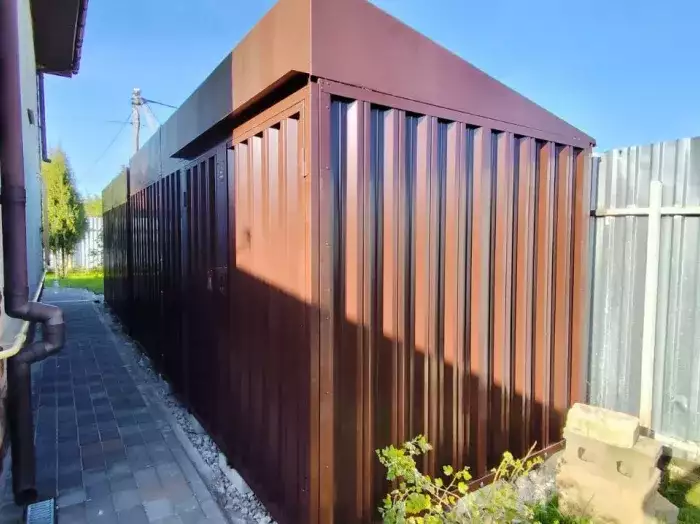 Нами была изготовлена стандартная конструкция дровницы с воротной группой в стильном и строгом графитовом цвете RAL 7024. Именно этот цвет был выбран, чтобы постройка гармонировала с цветом забора на участке.